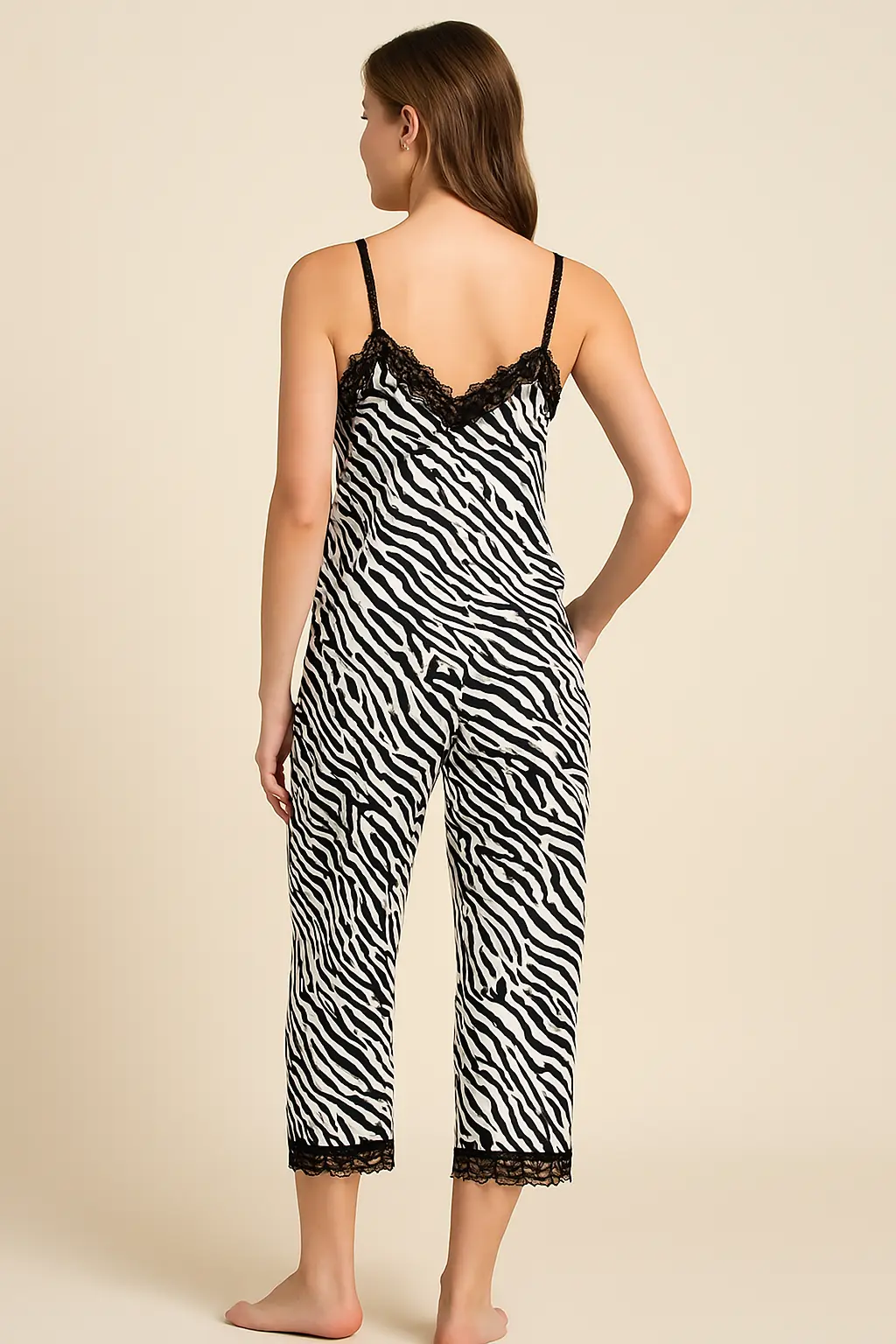 Ανακάλυψε την απόλυτη εμπειρία χαλάρωσης με αυτό το σετ πιτζάμας γυναικείο σε μοντέρνο ζεβρέ σχέδιο και εκλεπτυσμένες λεπτομέρειες από δαντέλα. Ένα κομμάτι που συνδυάζει την κομψότητα της lingerie αισθητικής με την άνεση που αξίζεις κάθε βράδυ. Το ύφασμα είναι απαλό σατέν, ιδανικό για την επιδερμίδα, ενώ οι λεπτές τιράντες και το ανάλαφρο κόψιμο αγκαλιάζουν το σώμα με θηλυκότητα και στυλ.
